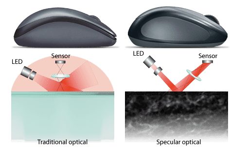 Оптичний сенсор менш чутливий на запилених або забруднених поверхнях. Вони не використовуються алгоритми виправлення руху чи передбачень, відключена апаратна акселерація, з цього миша з таким сенсором точніше рухається. Максимальна роздільна здатність такої миші набагато менша, ніж у лазерної.