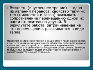 В'язкість (внутрішнє тертя) – одне з явищ переносу, властивість текучих тіл (рідин і газів) чинити опір переміщенню однієї їх частини щодо іншої. В результаті макроскопічна робота, що витрачається на це переміщення, розсіюється у вигляді