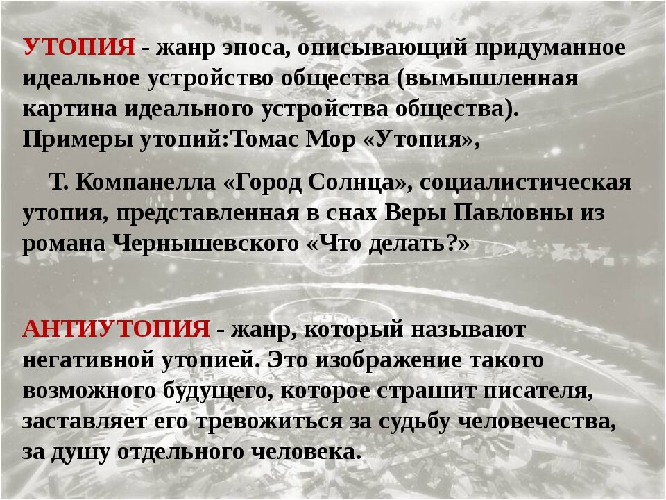 Антиутопія – жанр художньої літератури, що описує державний чи світовий уклад, у якому при первісному прагненні ідеального існування всім мешканців складаються негативні тенденції розвитку. Антиутопія є протилежністю утопії, що малює ідеальний світ.